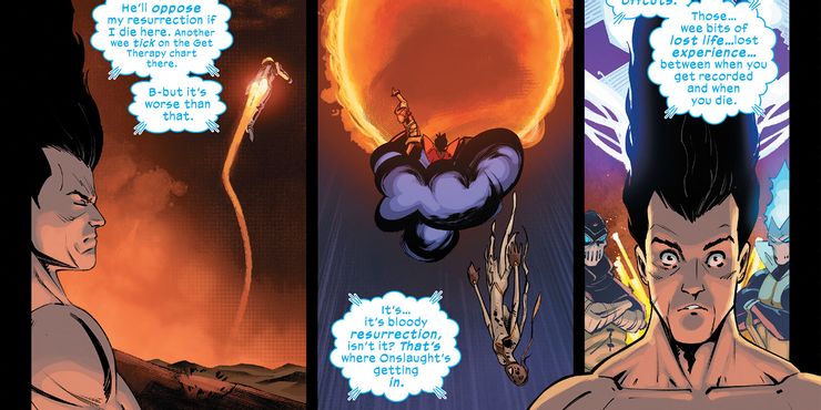 Esto significa que cuantas más muertes y, por lo tanto, resurrecciones, más personas puede afectar Onslaught. Además, cuanto mayor sea la brecha entre el récord y la resurrección, más control podría tener Onslaught sobre alguien y mayor la responsabilidad que podría tener. Si este es realmente el caso, entonces sería un desastre si alguien como Wolverine o la Bruja Escarlata resucitaran, considerando que les faltarían grandes lapsos de tiempo. Legion compartiendo su realización, combinada con las habilidades de aumento de Cortez, le permite a Nightcrawler ver una forma de derrotar a la entidad, pero desafortunadamente, Kurt es asesinado y no recuerda la solución una vez que ha resucitado. Esta oscura posibilidad hace imperativo que Nightcrawler recuerde lo que ha olvidado antes de que sea demasiado tarde.