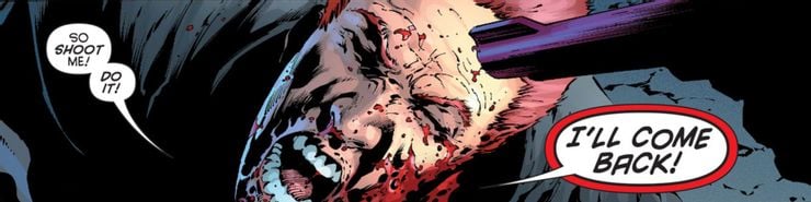 La línea tiene un aire de metaconciencia, con Jason que parece estar bastante convencido de que incluso si muere, solo será cuestión de tiempo hasta que resucite. No es el pensamiento más loco considerando que la muerte es prácticamente una puerta giratoria en la mayoría de los mundos de los cómics. Pero para Red Hood, la creencia de que realmente no puede morir realmente ayudaría a explicar su comportamiento de canon suelto cuando regresó de la muerte por primera vez.