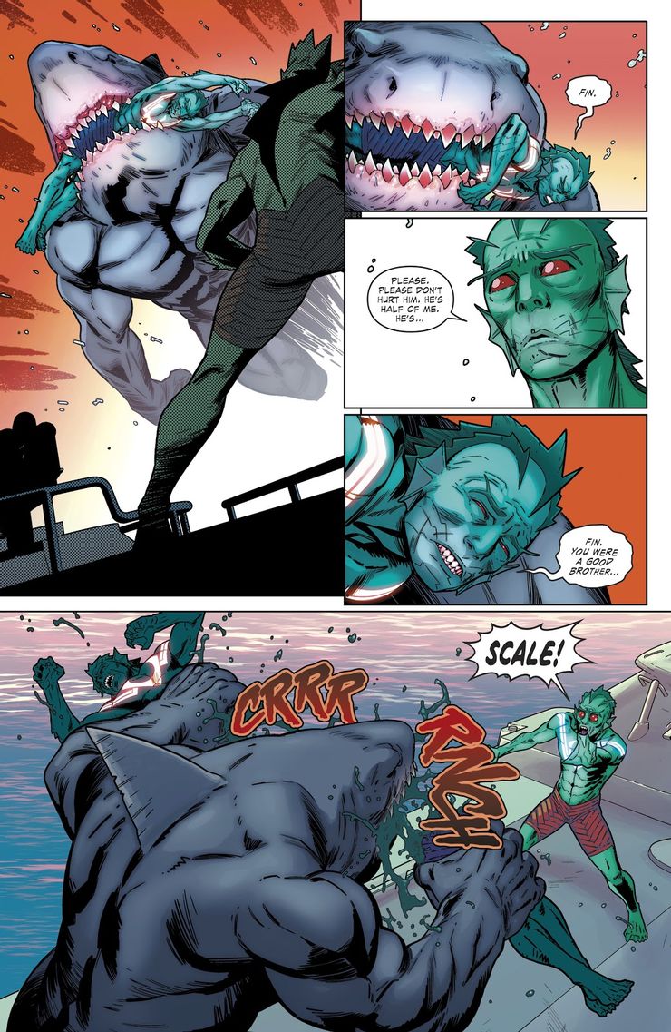 Karshon no solo obliga a Fin a ver la muerte de su hermano una y otra vez, sino que el Tiburón parece estar alegre cuando comparte psiónicamente su experiencia de acabar con la vida de Scale. Aquí es donde se aclara la mayor diferencia entre el tiburón y el tiburón rey. King Shark mata y se come a la gente porque el es un tiburon, mientras que el Tiburón persigue activamente a héroes y villanos por igual porque disfruta haciéndolo. King Shark tiene alguna posibilidad de redención, ya que se ha demostrado en el pasado que es capaz de adaptarse y cambiar su comportamiento asesino. Karshon, por otro lado, es todo un negocio y claramente no tiene interés en frenar sus violentos deseos.