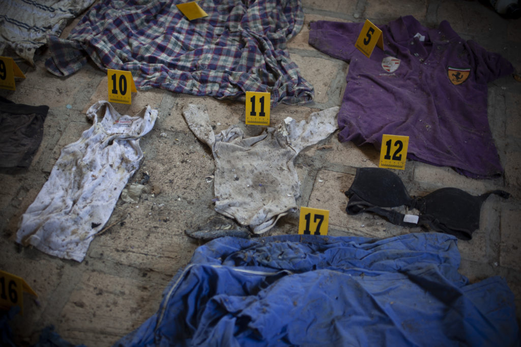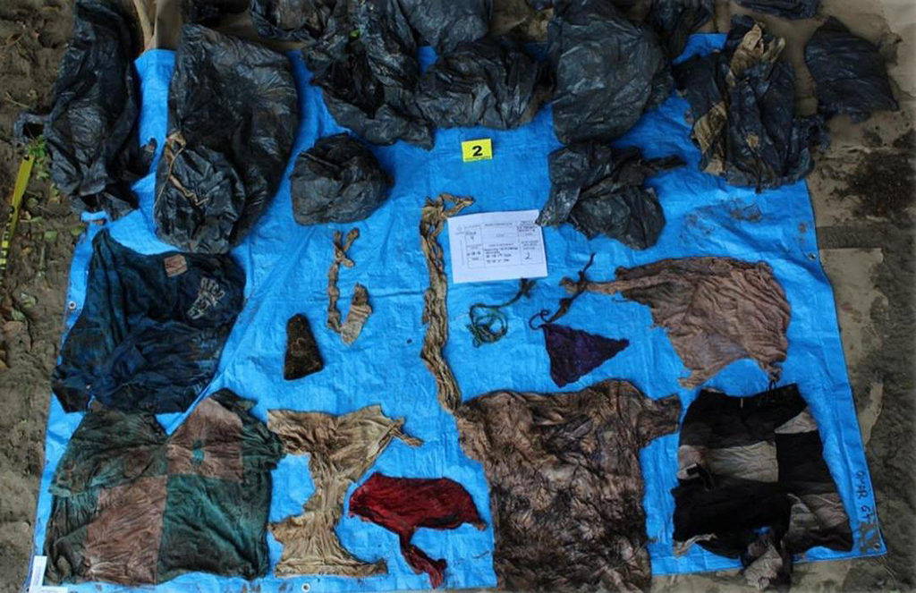 Una lona color azul cielo sirve como tendedero de lo que parece ser una truza, una camiseta, bolsas negras de plástico, pedazos de tela sin forma y hasta ropa de bebé. Todo pintado con el mismo tono color lodo por el tiempo que permanecieron bajo la tierra.