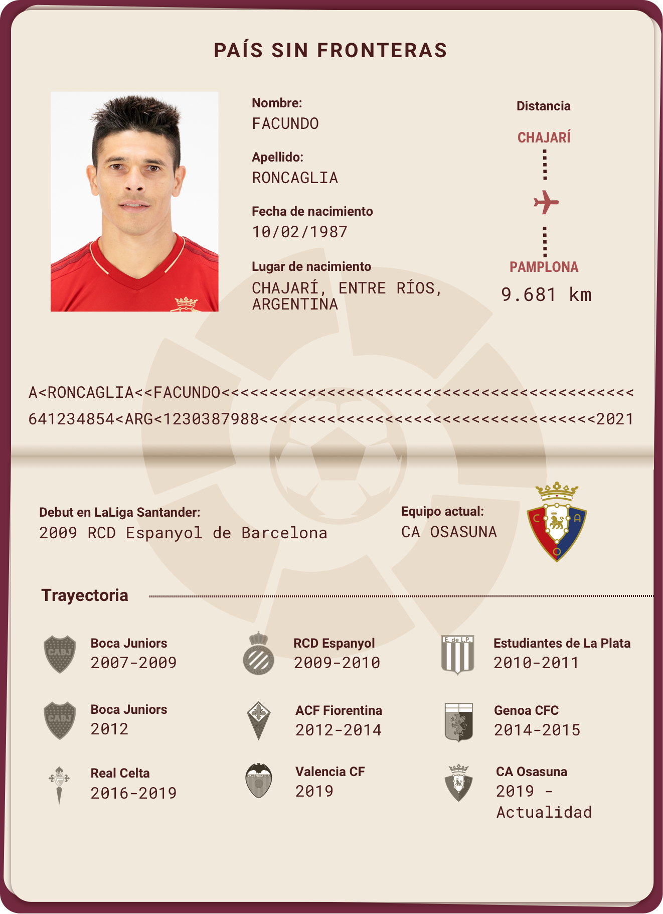 El defensa argentino de CA Osasuna, Facundo Roncaglia, oriundo de Chajarí (Entre Ríos, Argentina) llegó al RCD Espanyol de Barcelona en 2009 después de haber debutado en uno de los clubes más grandes de su país, Boca Juniors, de Buenos Aires. Chajarí, una ciudad de más de 50.000 habitantes al norte de la provincia de Entre Ríos, cuyas aguas termales son un destino turístico popular para la gente de la zona, es conocida por la producción de cítricos, mandarina y naranja. Los Roncaglia, descendientes de italianos, se dedicaron a ello. La Mesopotamia argentina, donde se encuentra, es la región geográfica con mayor cantidad de especies vegetales y animales del país.