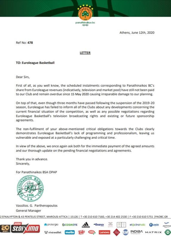 Después de hacer públicas sus intenciones de abandonar la Euroliga, el Panathinaikos envió una carta a la organización de esta competición en la que solicitó dos cosas: el pago inmediato de las cuotas atrasadas provenientes de ingresos compartidos, así como una actualización exhaustiva de las negociaciones y acuerdos financieros pendientes.