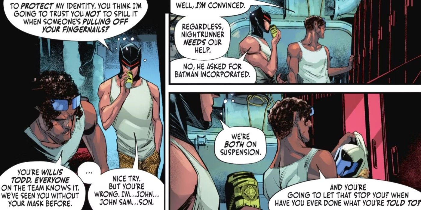 El número, la primera parte del arco de ‘Joker Incorporated’, está escrito por Ed Brisson, dibujado por John Timms, coloreado por Rex Lokus y rotulado por Clayton Cowles. En una de las casas seguras de Batman Incorporated en Melbourne, Australia, Wingman y Dark Ranger esperan una suspensión, pasando su tiempo trabajando en el equipo o, en el caso de Wingman, bebiendo cerveza. Mientras los dos conversan, Dark Ranger confirma que, para disgusto de Wingman, lo ha visto sin su máscara y sabe que es Willis Todd. Si bien esta es una gran noticia, es algo que los fanáticos habían sospechado todo el tiempo.