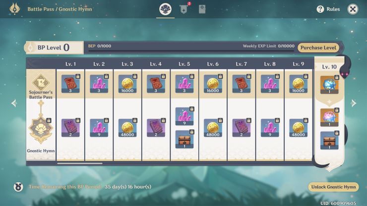 El Pase de batalla está disponible para cualquier jugador que alcance el rango de aventura 20. Los jugadores pueden realizar varias actividades, como gastar resina, cocinar, fabricar y simplemente iniciar sesión, para generar puntos para su progreso en el Pase de batalla y aumentar su nivel. Cada nivel otorga una recompensa gratuita (más una recompensa adicional si se compra el Pase de batalla) hasta el nivel 50. En el nivel 30 del Pase de batalla, si se ha desbloqueado (comprado) el Pase de batalla, los jugadores tienen la opción de elegir entre uno de cinco Armas de 4 estrellas.