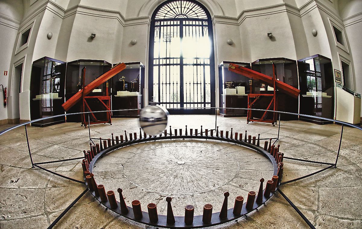 Un péndulo de Foucault es una esfera pesada -con mucha inercia- suspendida de un cable muy largo y capaz de oscilar durante mucho tiempo seguido, de manera que, al mantenerse fijo su plano de oscilación, este se desplaza con respecto al suelo al girar la Tierra.