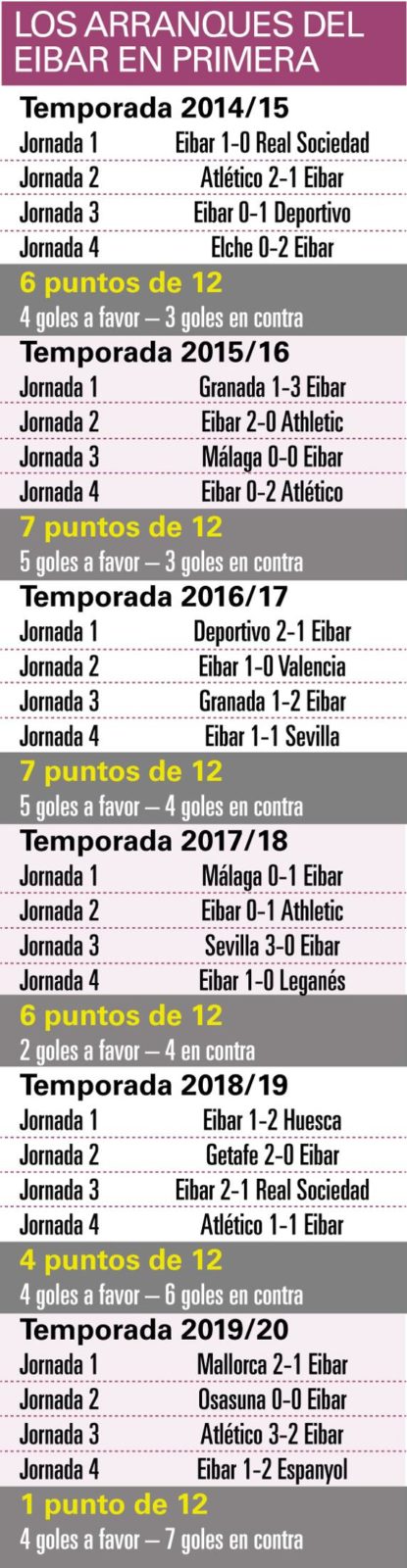 El Eibar ha ido apaciguando su sed de competición año tras año. A excepción de este curso y del anterior, los armeros lograron al menos dos victorias en las primeras cuatro jornadas. La tónica se rompió la pasada campaña, con un único triunfo y esta temporada la debacle ha sido mayúscula. Parte de la culpa está en el trabajo defensivo, con un Eibar que ha encajado siete goles y ni siquiera ha podido frenar la sangría con una retaguardia de gala como la que intentó parar al Espanyol.