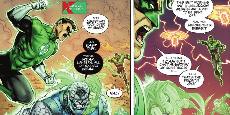 Renaciendo Apokolips con su nuevo poder de Linterna, Darkseid pasa a la ofensiva atacando a los amigos de Hal de la Liga de la Justicia. Y mientras Hal se queda solo, despojado y cabizbajo, camina hacia las llamas de energía esmeralda de Apokolips, extiende su mano y murmura para sí mismo: “Vamos Jordan … ese monstruo él – él te usó … te usó. Nadie se sienta al margen “. A continuación, se lo vio completamente encendido y cargando a la batalla con un ejército gigante construido de miembros de la Liga de la Justicia detrás de él mientras gritaba: “¡Me usaste! ¡Se apoderó de mi mente! ”Hal usa el recuerdo traumático de convertirse en Parallax como combustible para impulsarlo hacia adelante de una manera que finalmente lo ve derrotar a Darkseid arrojándole sus propias Boom Nukes directamente a la cara y eliminándolo por completo.