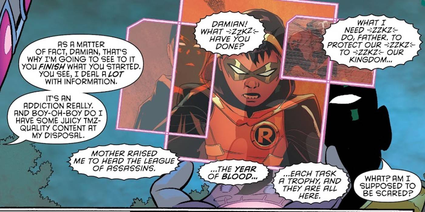 Una persona sabe quién es ahora y qué hizo Robin como Damian al Ghul. Si bien los pecados que cometió y las atrocidades en las que participó están en su pasado, continúan atormentándolo. Especialmente porque una de las personas a las que Damian lastimó amenaza con revelar lo que le hizo a Batman y la Liga de la Justicia.