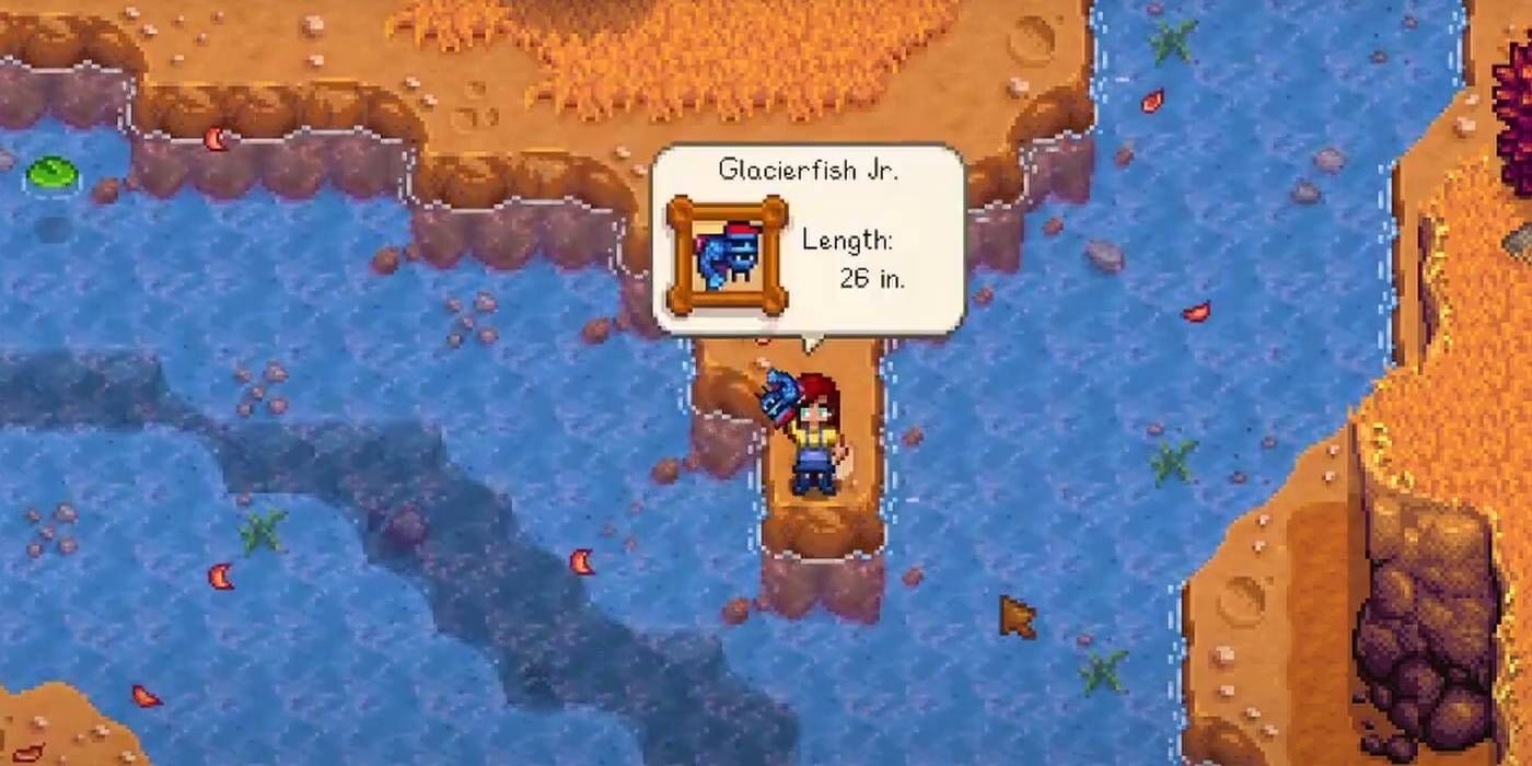 El legendario pez glaciar Actúa como lo opuesto al pez carmesí en muchos sentidos y solo está disponible para pescar durante la temporada de invierno. Viaja hacia el sur hasta el borde de la isla Arrowhead en el bosque Cindersap durante esta época fría para encontrar ríos helados donde puedas pescar. Debes tener un nivel de pesca de al menos 6 para capturar el pez glaciar, que solo aparece durante el día antes de las 8 p.m.