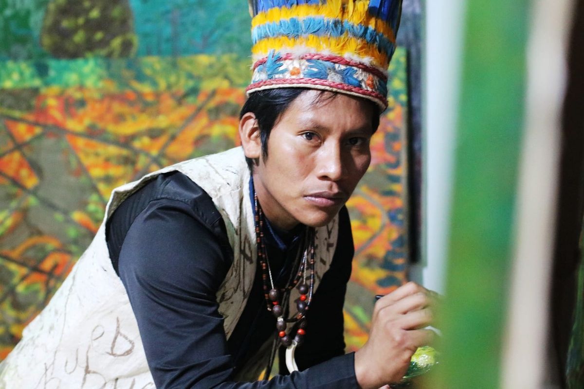 Así surge Canasto de la Abundancia, un proyecto que comenzó con su compañera Leo Fiagama y que conecta la selva con la ciudad. Su propia casa es restaurante, taller artístico y maloka. “Es un pedazo de nuestra tierra”, zanja. Las paredes están repletas de sus coloridos cuadros: ríos, vegetación, germinaciones de la “madre coca”… Sus obras son un viaje al saber de su gente y a su niñez. Pero también son una mirada crítica al genocidio que sufrió su pueblo.