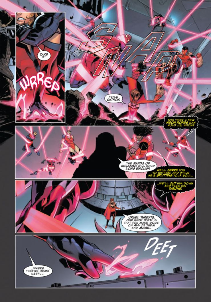 Scarlet Witch ata a Darkhold Defiled en las Bandas de Belasco mientras amenazan con servirla directamente a Chthon.