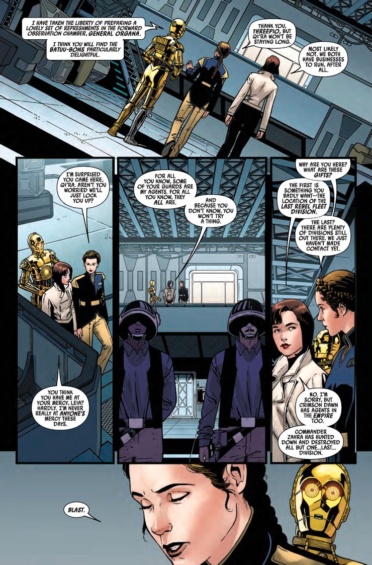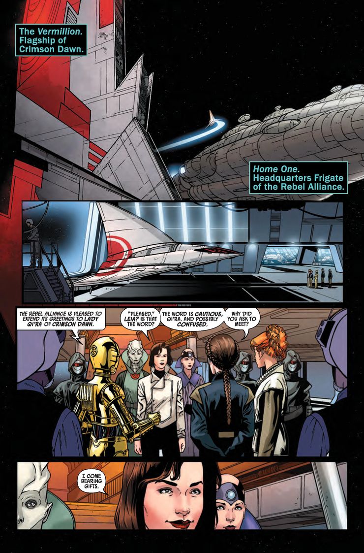 En números anteriores de Guerra de las Galaxias, la galaxia ha estado en un período aún mayor de agitación gracias al resurgimiento de Crimson Dawn, el sindicato del crimen fundado por el difunto ex Sith Lord Maul. Ahora dirigido por el antiguo amor de Han Solo, Qi’ra, Crimson Dawn ha estado haciendo grandes olas al enfrentar a los sindicatos rivales entre sí y desplegar agentes ocultos en toda la galaxia con la intención de derrotar a los Sith que controlan el Imperio. . Como tal, Qi’ra de Crimson Dawn se ha convertido en un aliado incómodo para la Princesa Leia y la Rebelión.