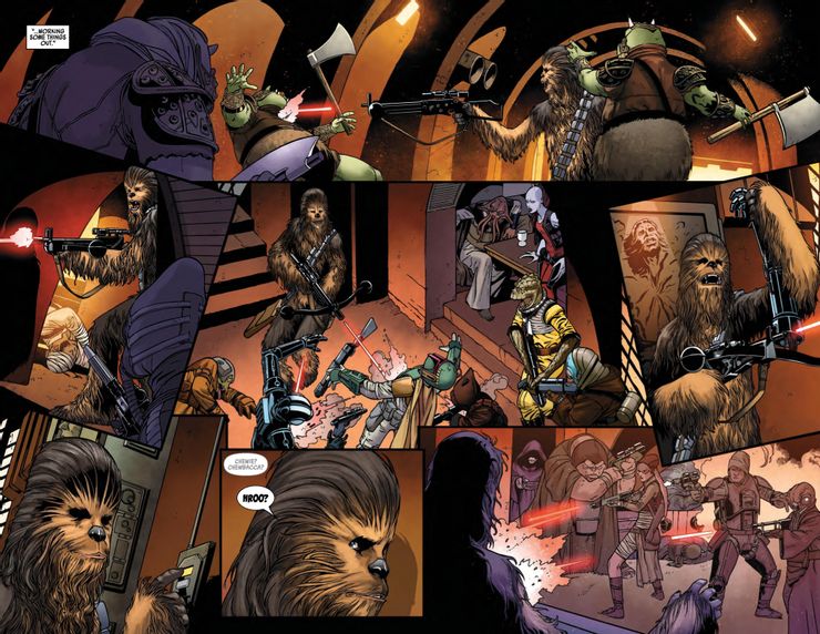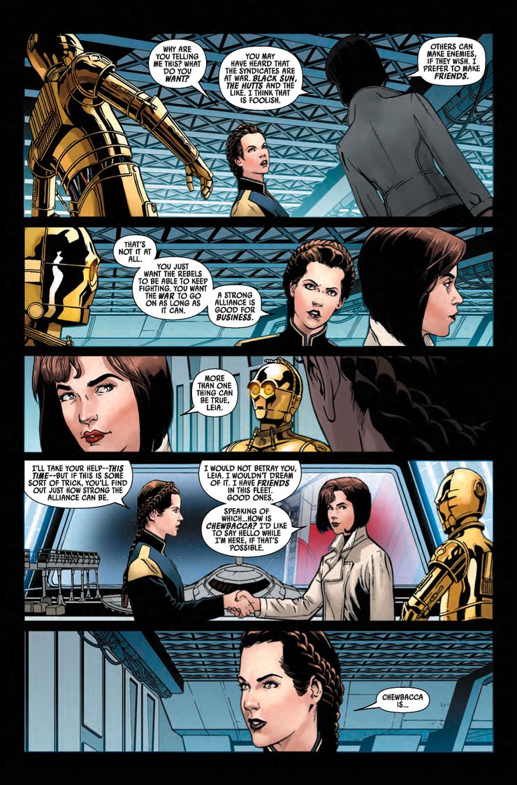 Por ejemplo, la nueva vista previa de Guerra de las Galaxias #22 por Charles Soule y Ramon Rosanas ve a Qi’ra visitando la nave capital de los rebeldes Inicio uno, ofreciendo la ubicación de su división final que falta. Esencialmente, el principal interés de Qi’ra radica en que la Rebelión continúe su guerra con el Imperio, ya que ayuda a promover sus propios objetivos. Ella también desea reunirse con Chewbacca dado el tiempo que ha pasado desde la última vez que se vieron. Sin embargo, Leia revela que Chewbacca está comprometido de otra manera, con la vista previa que muestra al primer oficial de Solo en Tatooine, atacando el palacio de Jabba en un asalto frontal completo para salvar a Han como un ejército de un Wookiee. Presuntamente, Chewbacca está utilizando la tecnología holo-sim para entrenar y planificar (no muy diferente de la holocubierta que se ve en Star Trek). Aquí están las páginas de vista previa y la sinopsis del próximo número: