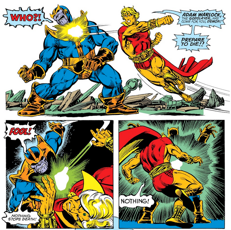 En Vengadores Anual # 7, Adam Warlock viaja a la Tierra y advierte a los Vengadores de la llegada de Thanos. Gamora intentó asesinar a Thanos después de enterarse de su verdadero plan, pero no tuvo ninguna posibilidad contra su enemigo y fue herida de muerte justo antes de que Warlock llegara. Warlock explica la máquina de Thanos que puede destruir estrellas, y si Sol (la estrella de la Tierra) explota, la supernova resultante destruirá el planeta y los miles de millones de humanos que lo llaman su hogar. Thanos llega con una flota enorme, pero los Vengadores abren un hueco en sus líneas del frente, y con un ataque dirigido por Adam Warlock, Thanos es derrotado y se retira rápidamente.