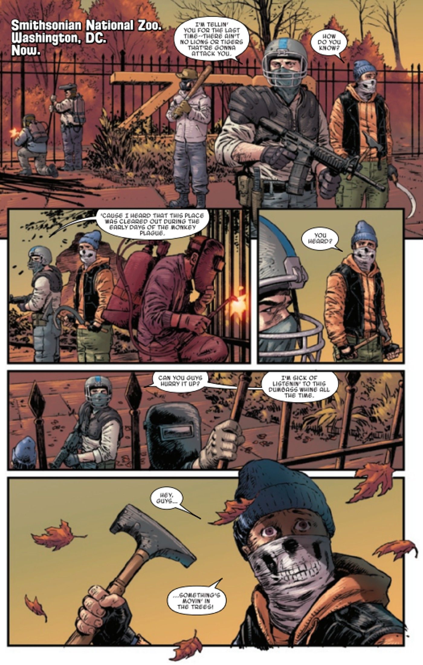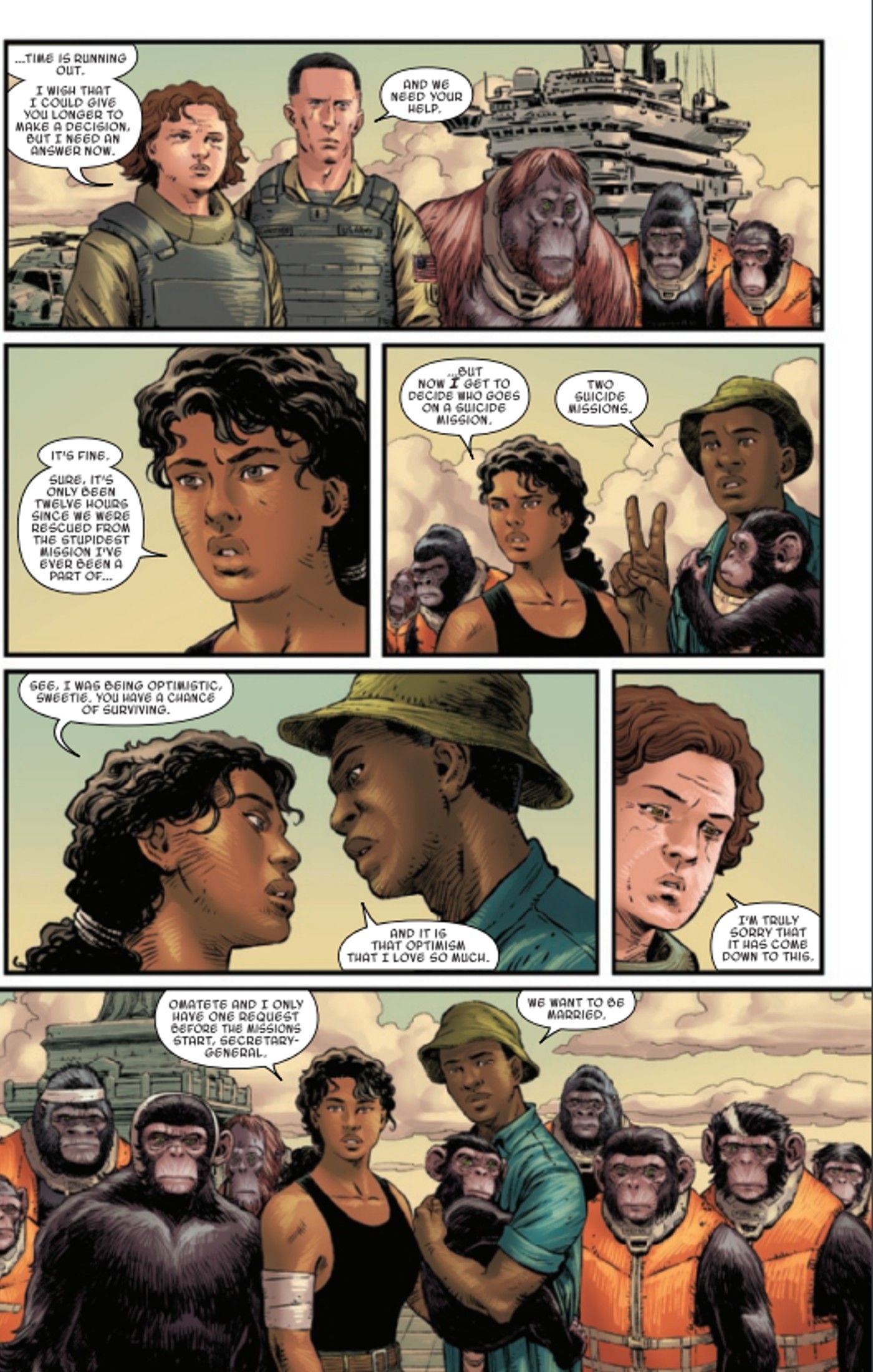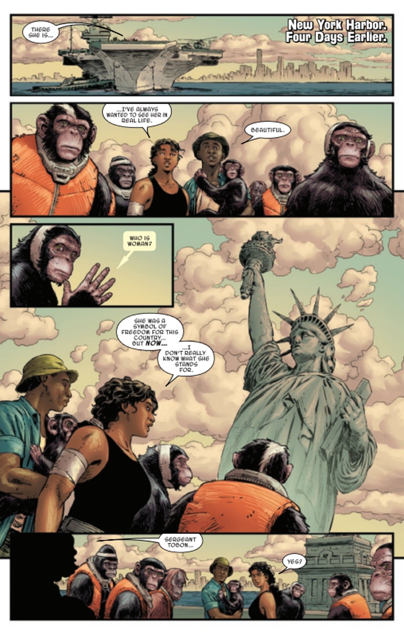 El cómic es una especie de precuela, que muestra lo que sucede cuando el virus ALZ-113 se materializa por primera vez y comienza a causar estragos en el mundo. Como se ve en los paneles de arriba, que tienen lugar en el puerto de Nueva York, se está educando a los simios sobre lo que es la Estatua de la Libertad, en un momento en el que ninguno de ellos había visto algo así antes. Uno firma la pregunta, “¿Quién es la mujer?” Se les cuenta que la estatua es un símbolo de libertad para el país, aunque ahora puede haber perdido su significado. Pensar en dónde encaja esta escena en la franquicia logra agregar un nuevo contexto al final de la primera película.