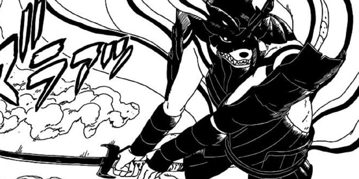 En el capítulo 8 de Boruto: Naruto Próximas Generaciones, Momoshiki desata su ira sobre los Shinobi reunidos. Los cuatro Kage que vinieron a rescatar a Naruto son eliminados por Momoshiki sin pensarlo dos veces, dejando solo a Naruto, Sasuke y Boruto para enfrentarse al poderoso villano. Sabiendo que Momoshiki puede absorber jutsu, Naruto confía principalmente en sus capacidades marciales antes de transformarse en su modo Sabio de los Seis Caminos y obtener ayuda de Sasuke. Juntos, los antiguos rivales pueden obligar a Momoshiki a tomar medidas más drásticas. Transforma el suelo en cabezas de serpientes y monstruos que asaltan a la pareja, lo que obliga a Naruto a combinar su modo Sabio de los seis caminos con su modo Chakra de nueve colas. Aunque Naruto todavía lucha incluso en este estado mejorado, recibe un impulso del justsu de nivel dios de Sasuke, Susanoo. De repente, el chakra Kurama se viste con la armadura de Susanoo. Con los mayores poderes de Naruto y Sasuke combinados, el gigante Kurama puede dividir fácilmente a los monstruos gigantes de Momoshiki en dos.