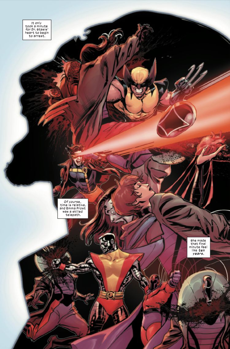 La naturaleza creativamente cruel de Emma Frost se muestra plenamente cuando mata al Doctor Stasis en Caída de la Casa de X (2024) #3 por Gerry Duggan y Lucas Wernick. En esta muerte instantáneamente icónica de Marvel, La Reina Blanca telepáticamente le da al clon Siniestro un ataque cardíaco masivo al hacerlo vivir sus mayores pesadillas dentro de su mente.