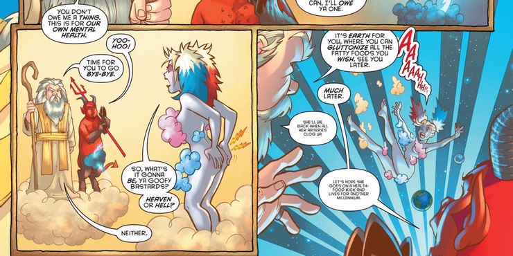 Durante la tortura, el Guasón graba una ‘J’ gigante en el pecho de Harley Quinn en un enfermizo intento de marcarla como suya para siempre. Si bien las ramificaciones emocionales y psicológicas de este acto de extrema violencia son evidentes, las físicas se vuelven aún más evidentes cuando Harley comienza a desangrarse rápidamente. Antes de que Joker termine el trabajo, Poison Ivy recupera el conocimiento y lo arroja por la ventana de su suite en el ático, luego se dirige hacia Harley. Momentos después, Harley Quinn muere y su alma es transportada al más allá. Si bien esto podría haber significado el final de la línea para la mayoría de los personajes, Harley Quinn muestra su poder más extraño para asegurarse de que su historia no termine aquí. Cuando se presenta ante Dios y el Diablo para que ellos decidan si debe pasar una eternidad en el cielo o en el infierno, ninguna entidad la quiere, ya que cada uno de ellos la encuentra demasiado molesta para tratar con ella para siempre. Entonces, en lugar de decidir dónde terminaría su alma por la eternidad, Harley Quinn es enviada de regreso a la Tierra y resucita en el proceso.