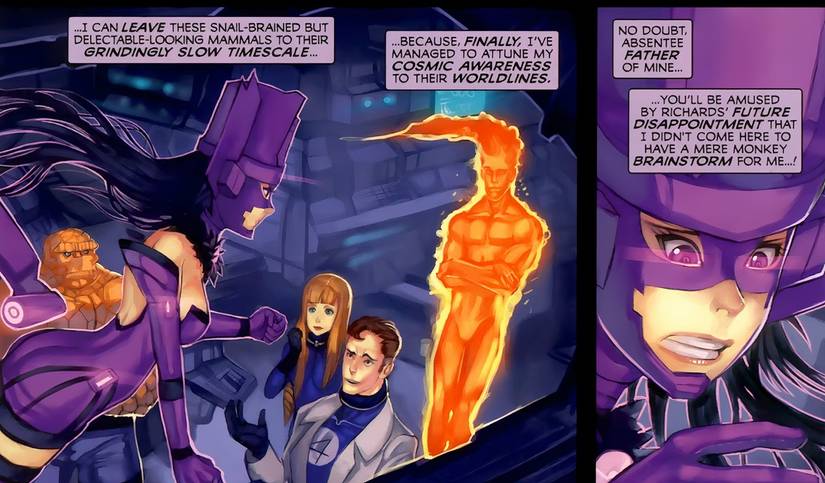 Cara a cara con los Cuatro Fantásticos, Galacta acelera sus percepciones a niveles fuera de la comprensión humana y dice: “Puedo dejar a estos mamíferos con cerebro de caracol pero de aspecto delicioso en su escala de tiempo lentísima porque, finalmente, he logrado sintonizar mi conciencia cósmica con sulíneas de palabras.“Usando estos”líneas del mundo”, Galacta se asoma al pasado y al futuro de los Cuatro Fantásticos. Como resultado, les da pistas a los lectores sobre lo que sucederáNo sabemos exactamente cómo funciona realmente la omnisciencia de Galactus.