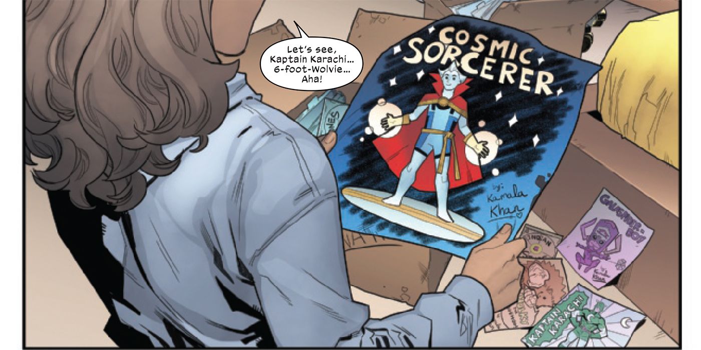 “/> La figura de sus pesadillas se parece a Silver Surfer con la capa del Doctor Strange, pero no es hasta que Kamala habla de sus sueños con su mejor amigo Bruno que se da cuenta de quién podría ser: un personaje de fan que ella inventó llamado “Hechicero cósmico.” Su excusa para no recordar previamente al personaje es que hace “MUCHOS fanfics.” Al buscar un fanart de él que ella alguna vez hizo, los lectores ven que descarta imágenes de Kaptain Karachi (un riff paquistaní del Capitán América), Galaspider-Boy (una combinación de Galactus y Spider-Man) y un personaje de 6 pies de altura. Glotón.