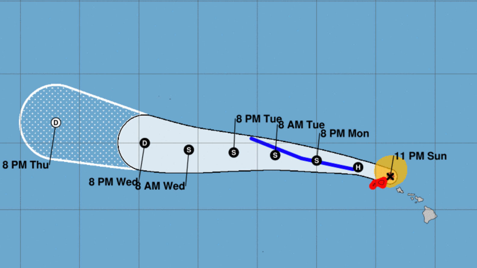 De acuerdo con el boletín del organismo meteorológico de las 11 pm del domingo, Douglas se mantiene como un huracán de categoría 1 con vientos máximos sostenidos de 90 mph.