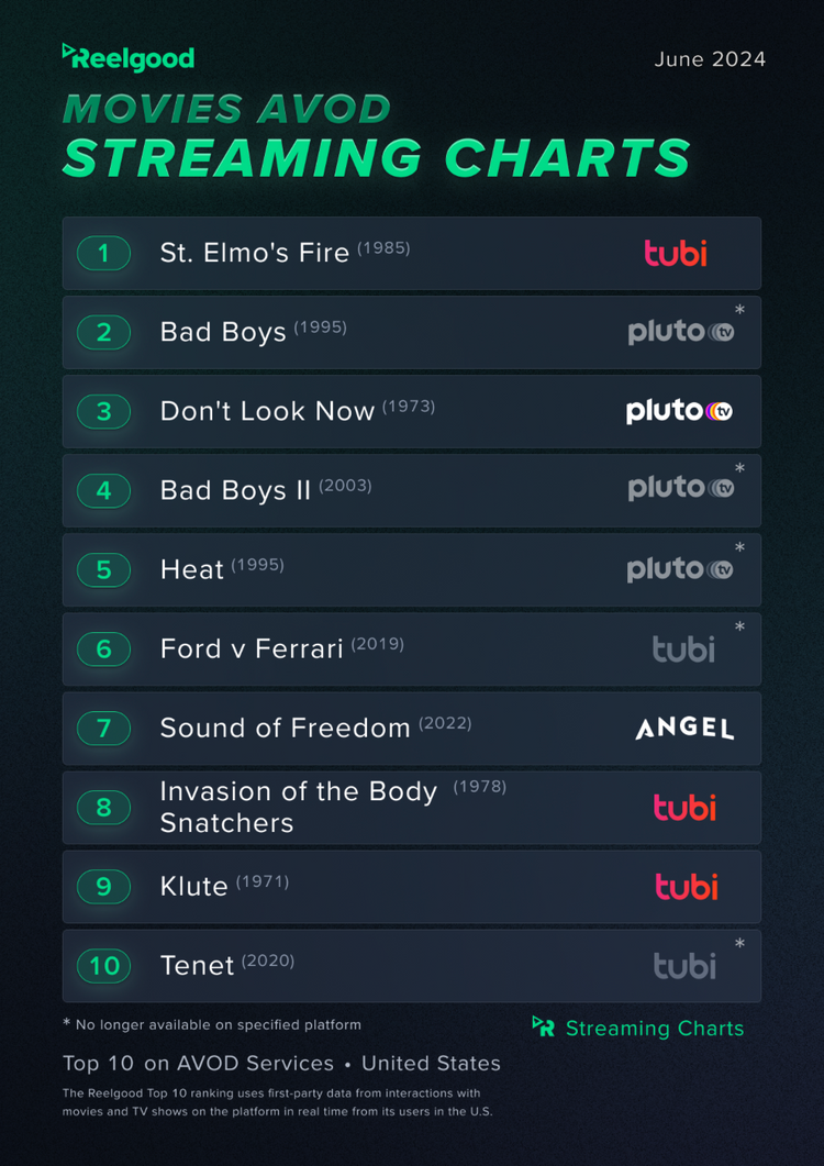 Nuevos datos de Reelgood ahora revelan que Principio Fue la décima película más popular en AVOD en los EE. UU. durante el mes de junio.El título no está a la altura de otras películas como Clute (1971), La invasión de los ladrones de cuerpos (1978), y Sonido de la libertad (2023). Consulta la lista completa de las 10 mejores películas AVOD a continuación: