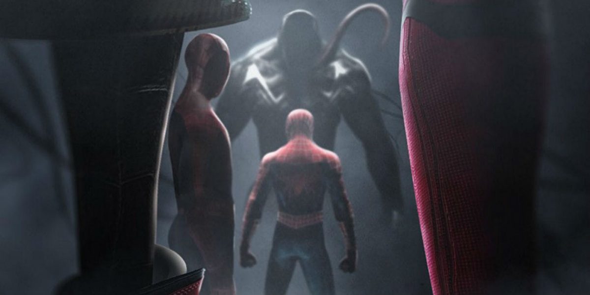 Frente a Venom está Spider-Man de Tobey Maguire, y justo detrás de él está Amazing Spider-Man de Andrew Garfield. En primer plano están los pies que pertenecen a. Araña-versoMiles Morales y MCU Spider-Man de Tom Holland. Esta es una actualización de un póster anterior para una película hipotética llamada Spider-Man: Homies, en el que solo Miles Morales y el MCU Spider-Man se enfrentaban a Venom.