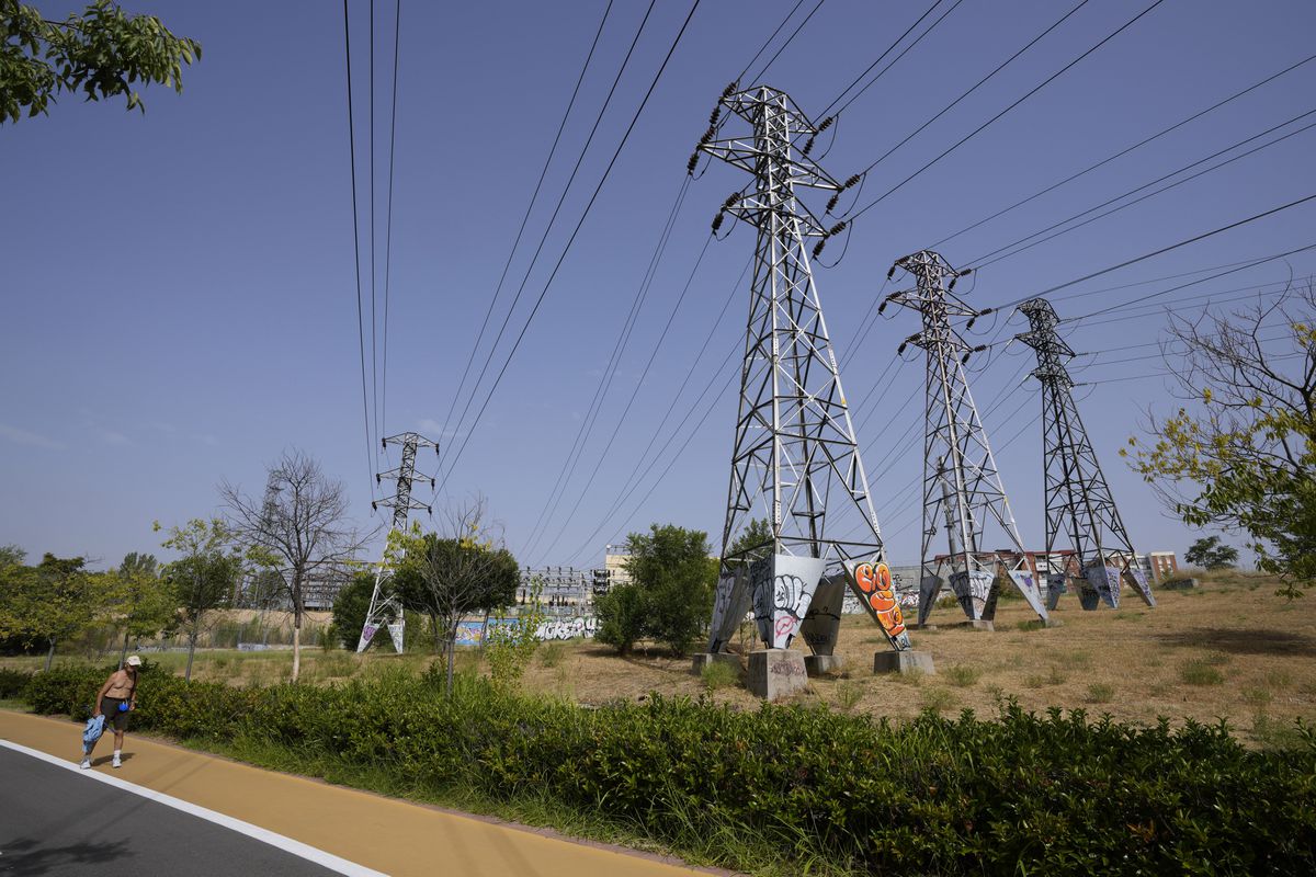 Un hombre camina junto a las torres eléctricas de una subestación eléctrica de Madrid, este miércoles.Paul White / AP