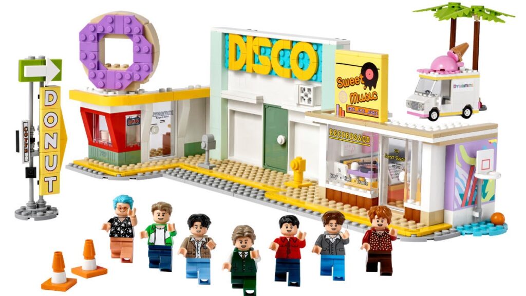 “Captura la energía alegre de los íconos del pop del siglo XXI RM, Jin, SUGA, j-hope, Jimin, V y Jung Kook con el set de videos musicales LEGO Ideas BTS Dynamite (21339). Encuentra tu ritmo de construcción para recrear escenas coloridas de la video de su sencillo multiplatino Dynamite, con versiones de ladrillos LEGO de la discoteca, la tienda de discos, la tienda de donas, el camión de helados y más. Agregue minifiguras LEGO de los miembros del grupo a las diferentes ubicaciones o colóquelas en el escenario especial y gira la rueda para verlos bailar”.