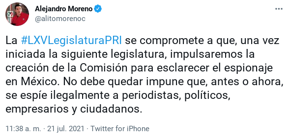 El presidente nacional del Partido Revolucionario Institucional, Alejandro Moreno Cárdenas, propuso la creación de una Comisión Especial de Investigación al espionaje en México, en el marco de la próxima LXV Legislatura de la Cámara de Diputados.