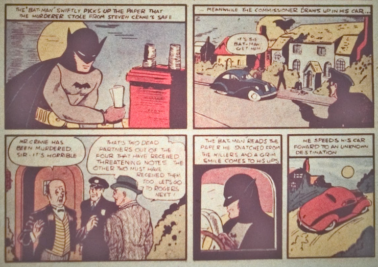 Al rastrear a una banda de asesinos, Batman se encuentra con la policía y Gordon, quienes intentan perseguir a Batman. Al encontrar una pista en el papel, Batman se marcha en su auto deportivo rojo brillante, el primer Batimóvil de la historia. El Batimóvil rojo aparentemente no tiene dispositivos ni funcionalidad aparte de ser un automóvil bastante rápido, pero también es de color rojo brillante.