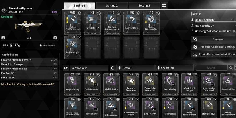 Al aplicar Módulos a la Fuerza de Voluntad Eterna en El primer descendienteHay algunas opciones destacadas para mejorar sus capacidades de combate. Las mejores opciones son Refuerzo de estrías, Punto de mira débily Mejor visión. El refuerzo de estrías debería estar equipado en casi todas las armas de tu arsenal y vale la pena maximizarlo usando fragmentos de Kiuper en El primer descendiente.