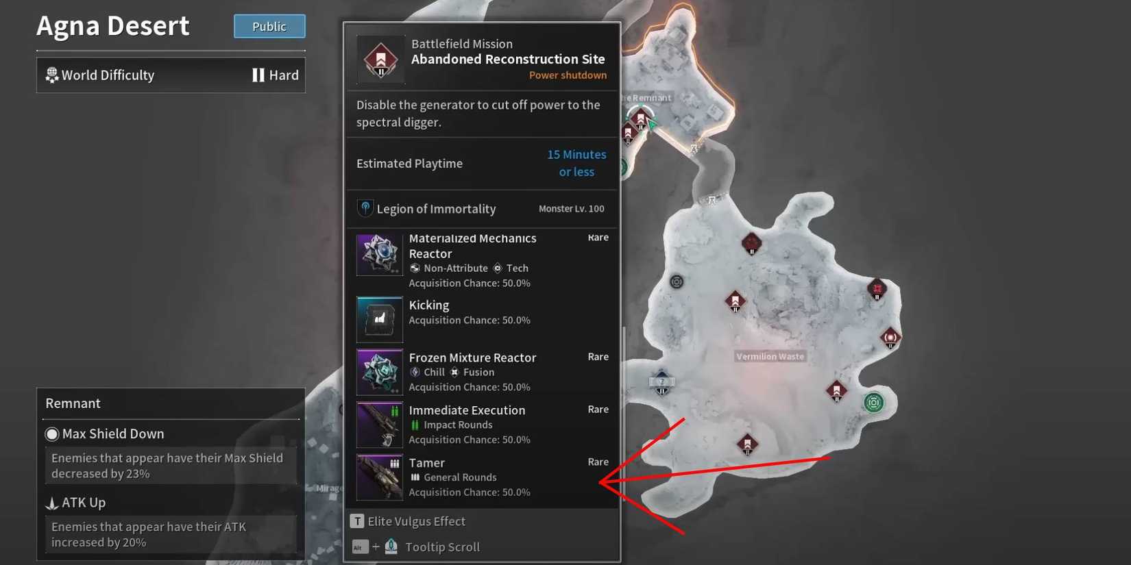 El domador tiene un 50% de posibilidades de caer en el Sitio de reconstrucción abandonado en el desierto de Agna o el Instalación ocupada por la Orden en el barranco de la Noche Blanca Área. Cualquier ubicación te da la misma oportunidad de farmear al Tamer, así que elige el lugar que creas que tiene las misiones más fáciles de completar. Esta rara arma usa rondas generales como munición, que es posible que ya tengas en abundancia para otras armas.