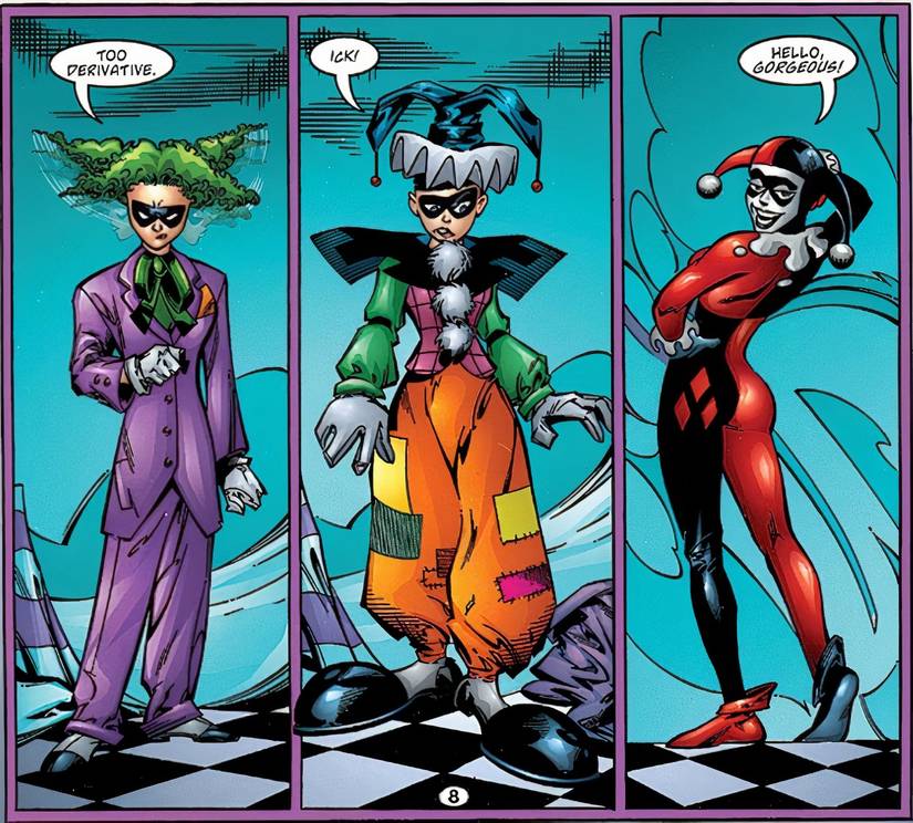 El conjunto de Joker de Harley la presentaba con un traje morado de gran tamaño combinado con un pañuelo amarillo, una camisa de vestir verde y una corbata a juego. Completó el look con el calzado característico de Joker, zapatos de espectador, junto con una peluca verde rizada y guantes blancos. Sin embargo, este disfraz duró poco, ya que duró solo un panel. La propia Harley lo consideró “derivado“antes de descartarlo inmediatamente. Luego probó dos disfraces más antes de decidirse por su icónico disfraz de bufón rojo y negro.que sigue siendo su estilo característico hasta el día de hoy.