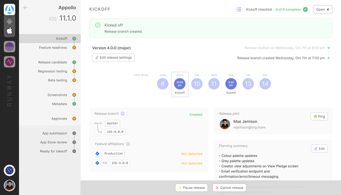 Una vez configurado, Runway lee la información de los distintos puntos de integración, la interpreta y toma medidas. Todos los miembros del equipo pueden iniciar sesión en Runway a través de su interfaz web y ver exactamente dónde se encuentran en el ciclo de lanzamiento y qué es lo que aún queda por hacer.