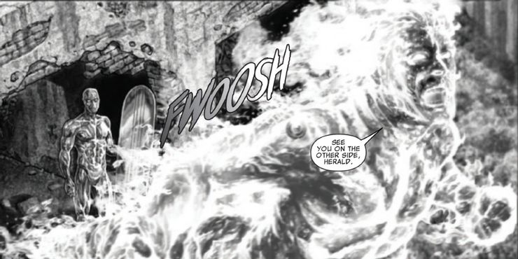 Sin embargo, el verdadero enfoque de la historia son los recuerdos. Sin hogar y sin gente en su vida, el Silver Surfer’s los recuerdos se desvanecen. Comparándolo con la Antorcha Humana, queda claro que no es la tierra física por la que el androide está dispuesto a morir, es la memoria de la tierra. Esta es también la razón por la que Human Torch es la elección perfecta para esta historia. Como primer héroe de Marvel, ha visto todos los eventos del universo Marvel junto a los fanáticos del cómic en el mundo real. Hay una nobleza poética en ver el Antorcha Humana presencia tanto el principio como el final del Universo Marvel.