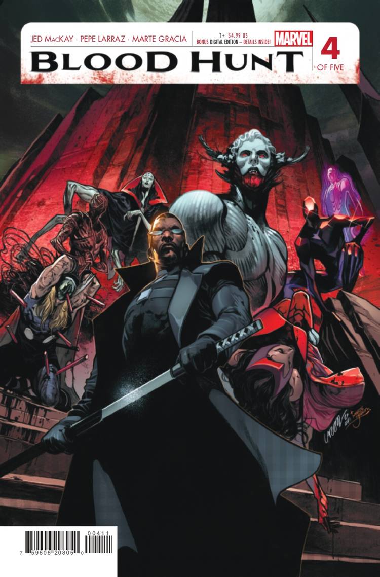 caza de sangre El número 4 de Jed MacKay, Pepe Larraz y Marte Gracia comienza con una situación desesperada: el horizonte oscurecido de Nueva York queda borrado por un templo atlante maldito; Doctor Strange y Clea se ven obligados a recurrir a Doom en busca de ayuda; y Black Panther sigue a las órdenes de Blade. Con sus planes a punto de concretarse, “Blade” abandona la artimaña y revela su verdadera identidad a un sorprendido T’Challa.