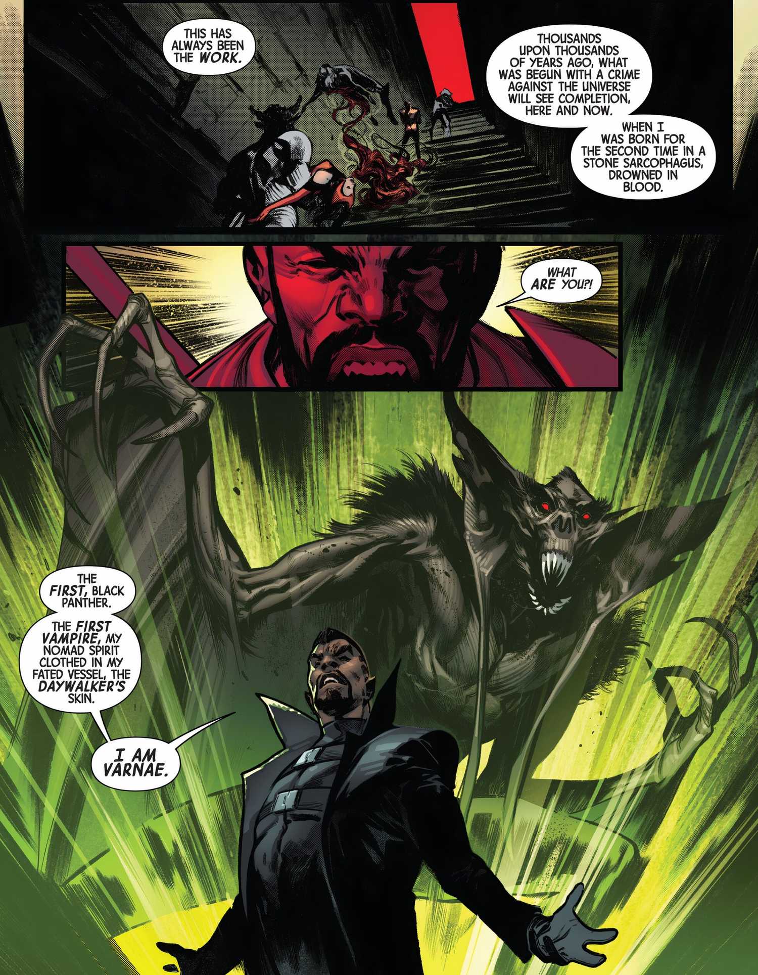 “[I am] el primer vampiro, mi espíritu nómada vestido con mi recipiente predestinado, la piel del Caminante Diurno. Soy Varna.” El cuerpo de Blade se regodea, revelando que La antigua némesis de Blade ha estado poseyéndolo todo el tiempo.