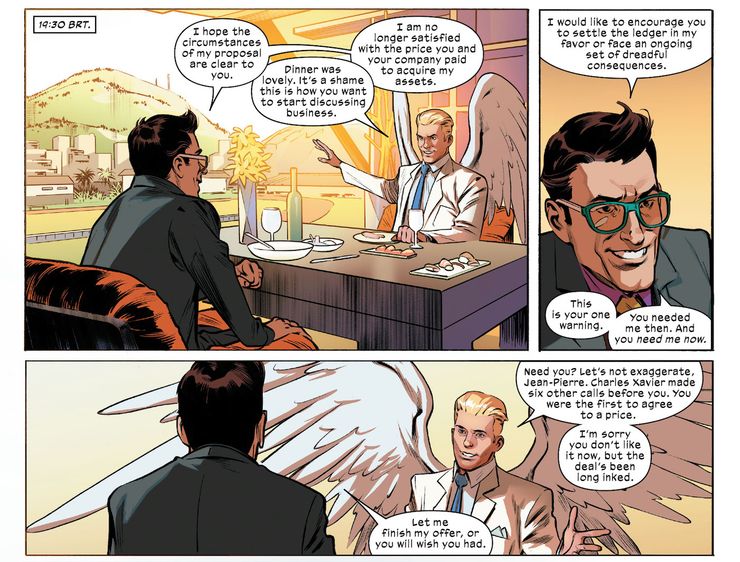 Angel y Penance se ponen manos a la obra en las páginas de X-Corp # 1 por Tini Howard, Alberto Foche, Sunny Gho, Clayton Cowles y Tom Muller. Xavier ha enviado a Angel a Brasil para tratar con Jean-Pierre Kol, un hombre de negocios que ha trabajado con Xavier en el pasado. Kol no está satisfecho con los precios que los mutantes han pagado para adquirir sus activos y quiere extorsionar más dinero de X-Corp. Creyendo que tiene todas las cartas para obtener lo que quiere de los mutantes, Kol ha desatado malware en las plantas de procesamiento de drogas de X-Corp y ha preparado una queja ante la Corte Internacional de Justicia con respecto a operaciones Krakoan potencialmente ilegales en Savage Land. Sin embargo, los mutantes dejan muy claro al final del problema que nunca corren el peligro de no obtener lo que quieren.