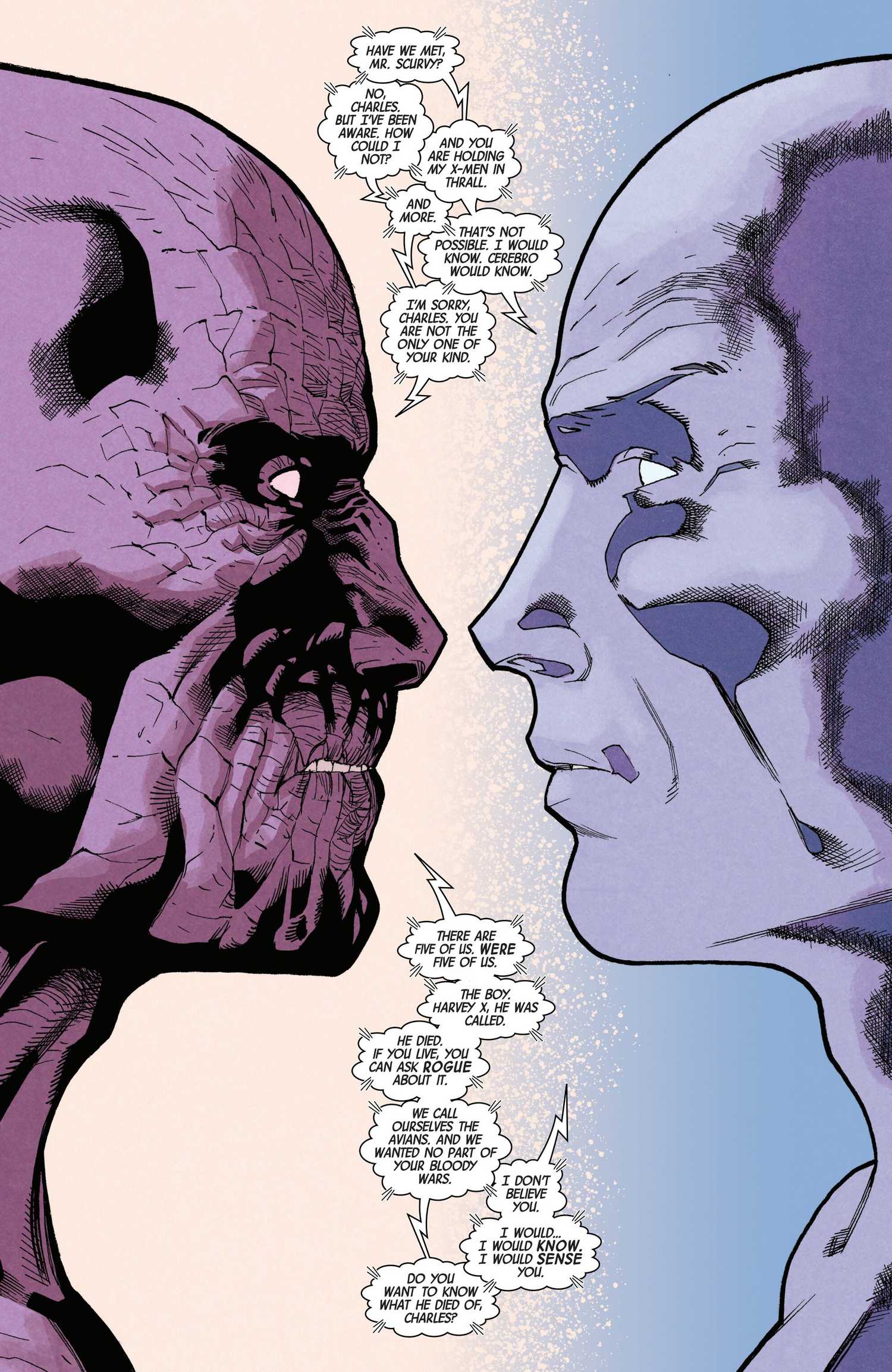En el número, el villano Scurvy revela que Charles es parte de los “Avians”, un grupo de cinco mutantes telepáticos. Desafortunadamente, este poder tiene un costo, como lo demuestra la muerte del primer lector aviar que conoció: el joven telépata Harvey, que murió en X-Men asombrosos #1 de Simone y David Márquez.