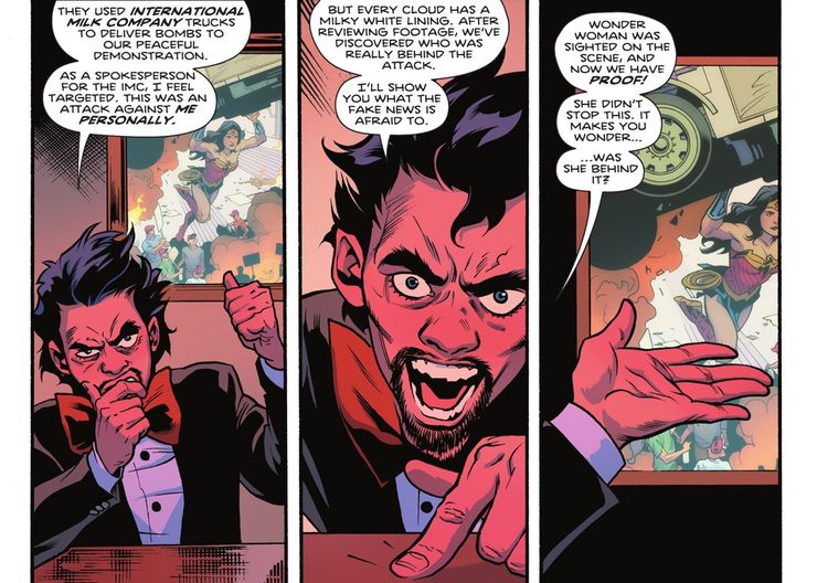 En Mujer Maravilla # 788 por Michael W. Conrad, Becky Cloonan y Emanuela Lupacchino, Dr. Psycho tiene un programa de entrevistas bastante popular en el que escupe retórica misógina y xenófoba mientras promociona un tipo de leche que comercializa como para hombres verdaderos. Invita a sus seguidores a protestar por la inclusión de Wonder Woman en la Liga de la Justicia fuera del Salón de la Justicia. Luego, cuando Wonder Woman intenta razonar con los manifestantes, detona bombas escondidas entre la multitud, dañando cruelmente a sus propios seguidores. Luego culpa a la Mujer Maravilla de la violencia y la destrucción, en un intento de empañar aún más su buen nombre. Wonder Woman ha tenido problemas con su imagen antes de esto, pero este es fácilmente uno de los problemas de relaciones públicas más frustrantes y peligrosos que ha tenido que enfrentar.