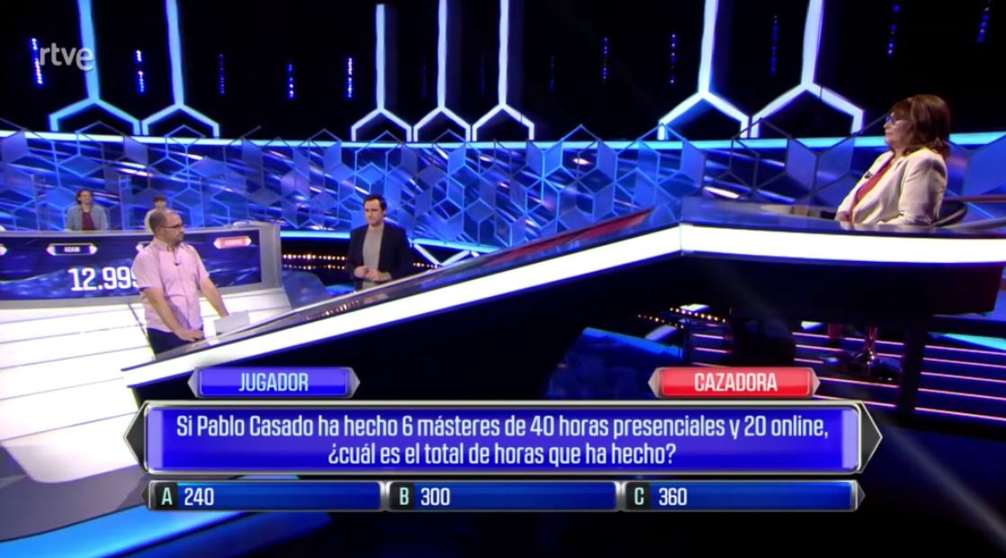 “Si Pablo Casado ha hecho 6 másteres de 40 horas presenciales y 20 online, ¿cuál es el total de horas que ha hecho?”. Con esta pregunta el concurso El cazador, que se emite de lunes a viernes en La 1 de TVE (y está producido por Mediacrest), se ha unido a las polémicas que rodean a TVE en este último mes con sus rótulos e imágenes en pantalla. La pregunta, que podría haber sido una más con cualquier otro nombre, hace referencia al caso Máster, por el que el líder del Partido Popular, Pablo Casado, fue investigado por si había recibido un trato de favor por parte de la Universidad Rey Juan Carlos de Madrid. La investigación principal del caso fue archivada en 2018. El programa ha pedido disculpas por una pregunta que, según ellos, “pretendía ser humorística”, pero que ha molestado a muchos espectadores.