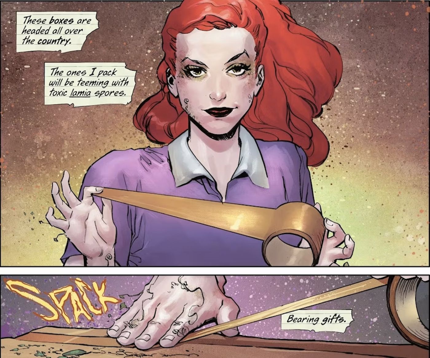 En Hiedra venenosa #16 Por G. Willow Wilson, Marcio Takara y Arif Prianto, las consecuencias de las acciones de Poison Ivy se arrastran hacia ella. Sin embargo, casi nadie sabe lo que sus esporas de Lamia han hecho a las personas a las que afectaban.