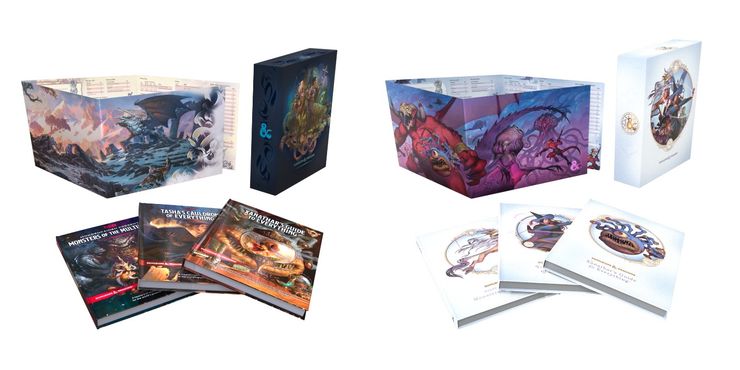 Habrá dos versiones del Juego de regalo de expansión de reglas de D&D liberado, como se ve arriba. Una versión del conjunto contará con ilustraciones tratadas con papel de aluminio para las portadas de los libros y para la pantalla DM. La otra versión del Juego de regalo de expansión de reglas de D&D será un lanzamiento de edición limitada, con nuevas ilustraciones para los libros, la pantalla de DM y el estuche. Esta versión solo se lanzará en las tiendas de juegos. las versiones de La guía de Xanathar para todo y D&D‘s El caldero de todo de Tasha que son parte de la Juego de regalo de expansión de reglas de D&D también incluirá algunas actualizaciones que se han publicado desde que esos libros se imprimieron originalmente.