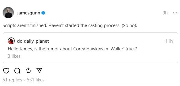 Cuando dc_daily_planet preguntó si “el rumor sobre Corey Hawkins” siendo observado por Waller es cierto, Gunn afirmó que el “Los guiones no están terminados. No he iniciado el proceso de casting. (Así que no)”.