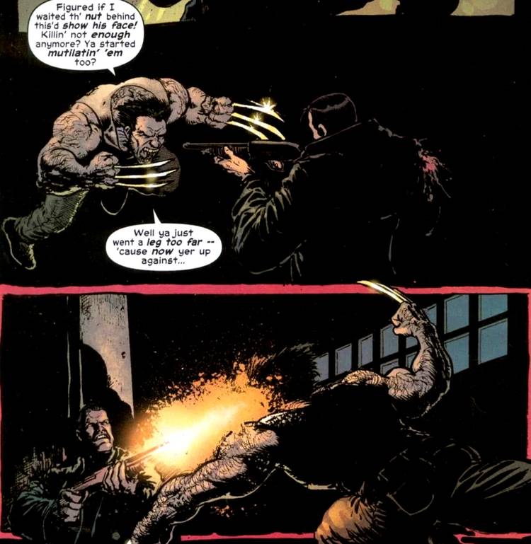 Todo el encuentro es puro Looney Tunes -Poco más que un enfrentamiento ultra violento entre el Road Runner y Wile E. Coyote, mientras el Punisher y Wolverine siguen tratando de uno de los demás de manera cada vez más brutal. El factor de curación de Wolverine significa que puede tomar todo el castigo que Castle puede lidiar, y Frank no contiene nada al tomar el X-Man. Dado que este es el título de Frank y el escritor Ennis no le importa a superhéroes como Wolverine, el Punisher termina llegando a la cima de esta pelea en particular, pero La verdad es que una batalla entre los dos podría ir de cualquier manera.