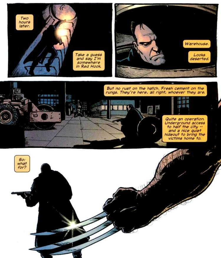 Los dos héroes se topan entre sí mientras están en el juicio del mafioso Tony Casino, que ha estado secuestrando a los gángsters en toda Nueva York y cortando las piernas en las espinillas. El castigo no pierde tiempo toparse con Wolverine, dándole una cara llena de dinero de pilos doce como saludo.