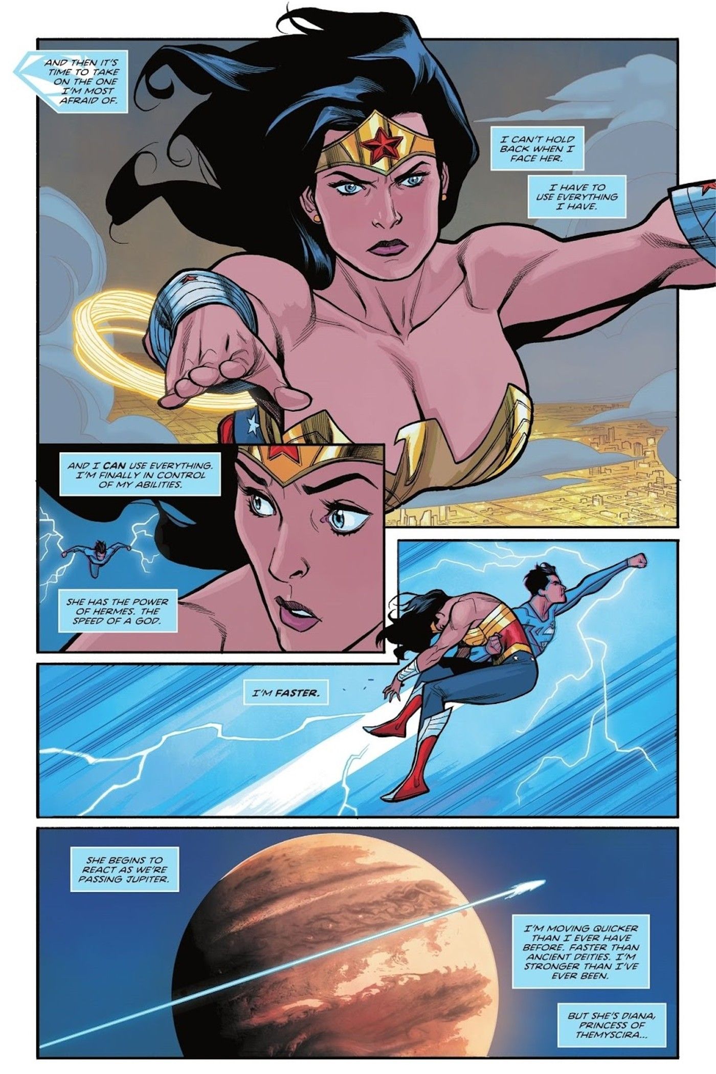 Las aventuras de Superman: Jon Kent # 6, escrito por Tom Taylor, con arte de Clayton Henry, color de Jordie Bellaire y letras de Wes Abbot, está lleno de acción, mientras Jon se abre camino a través de las fuerzas de Clark Kent, finalmente se encuentra cara a cara con Wonder. Mujer. Gracias a su nueva actualización de poder, Jon es más rápido y más fuerte que nunca. “pero ella es Diana, princesa de Themyscira”.