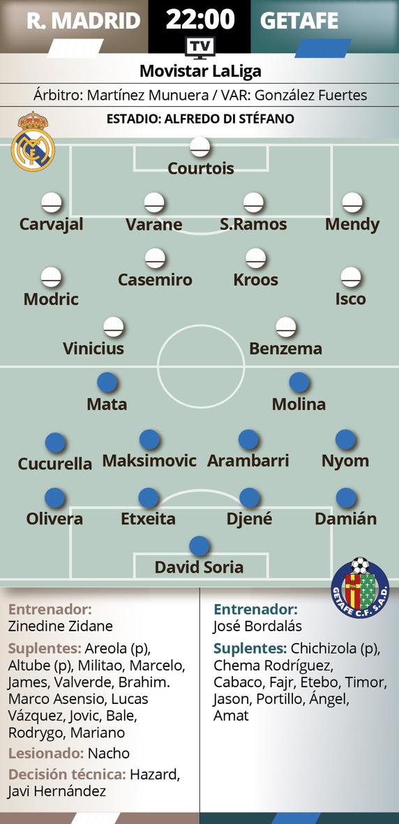 El partido que acoge esta noche el Di Stéfano es de esos que pueden marcar un título liguero. El Real Madrid recibe al Getafe y si gana, dejará al Barcelona a cuatro puntos lo que significa, aunque Zidane no quiere decirlo, que a los blancos se les despeja mucho el camino al título. No lo tendrá fácil el equipo merengue ante un Getafe revitalizado tras ganar a la Real Sociedad en su primer triunfo tras el regreso de LaLiga. Tres puntos que le rearman en su lucha por jugar en Europa la próxima temporada.