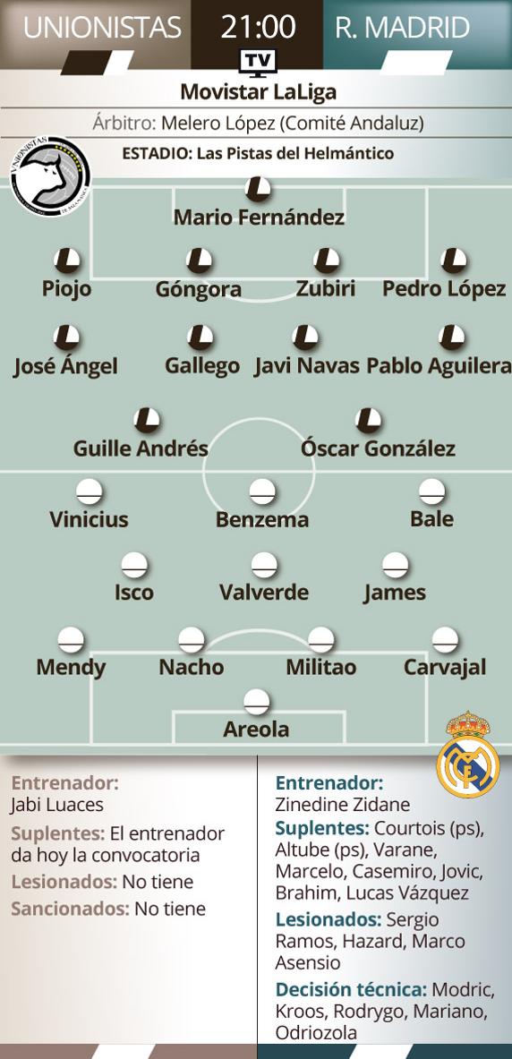 Enfrente del todopoderoso Real Madrid está Unionistas, un equipo que quiere seguir soñando y sobre todo disfrutar la oportunidad de jugar ante el Real Madrid. El conjunto que entrena Jabi Luaces llega en un gran momento de juego y de resultados. Para el partido de esta noche, el entrenador de Unionistas quiere sacar a su mejor once en el que no incluirá a los cuatro jugadores que han llegado en el mercado de invierno, como un reconocimiento a los que han empezado la temporada.